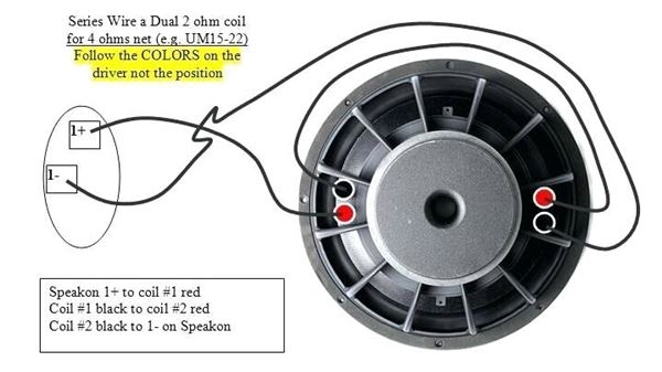 For a 2 Ohm setup, you would wire the positive terminal of one voice coil to the positive terminal of the other, and the same for the negative terminals. This parallel wiring configuration will cut the impedance in half, resulting in a 2 Ohm load. On the other hand, for a 4 Ohm setup, you would wire the positive terminal of one voice coil to the negative terminal of the other, and vice versa. This series wiring configuration will double the impedance, resulting in a 4 Ohm load.