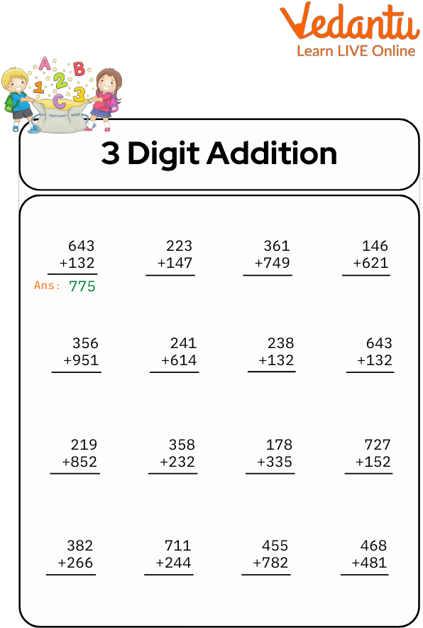 In schools, educators use Addition 3 Digit Numbers to help students practice skills. As an example, a math worksheet might include simple addition problems, while an English worksheet may have vocabulary exercises.