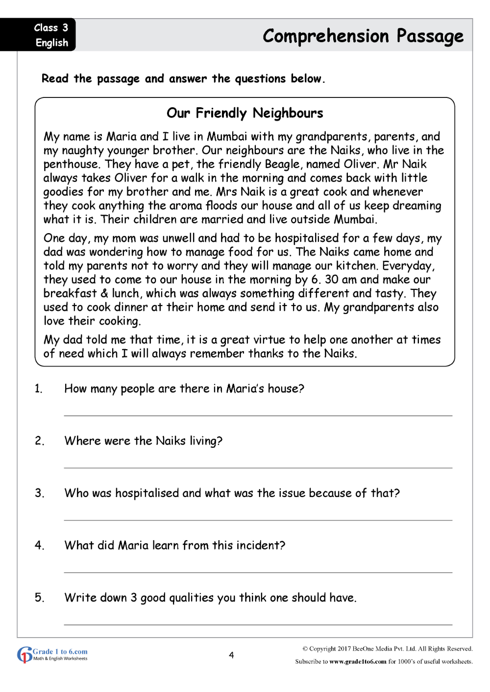 In educational settings, teachers use Comprehension For Class 3 to reinforce lessons. As an example, a math worksheet might include simple addition problems, while an English worksheet may have reading tasks.