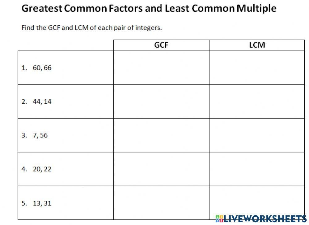 In schools, educators use Gcf Worksheets to reinforce lessons. As an example, a math worksheet might include simple addition problems, while an English worksheet may have grammar questions.