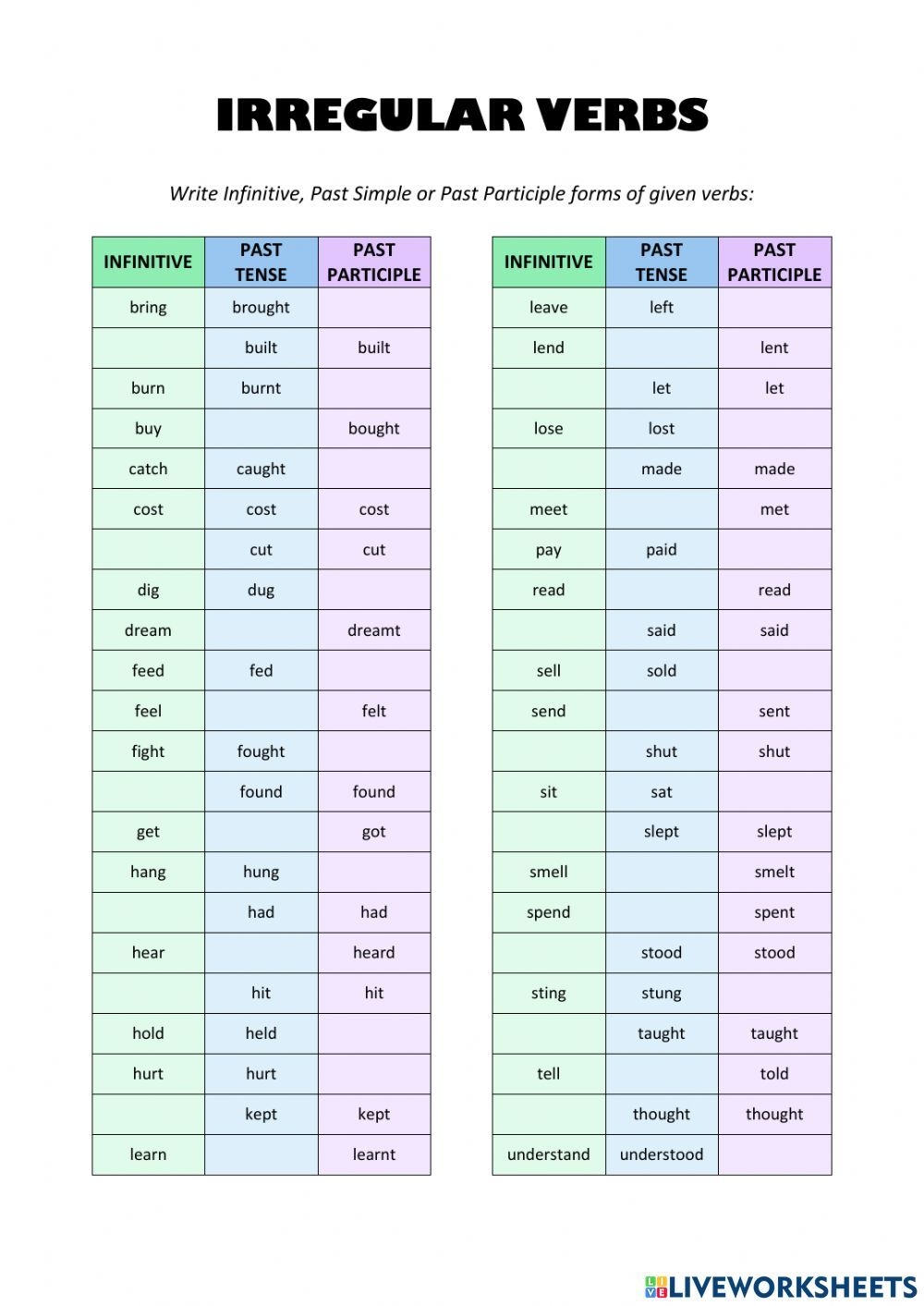 Learning irregular verbs in English can be a challenge for many students. However, using worksheets can help make this process easier and more enjoyable. These worksheets provide exercises that reinforce the correct usage of irregular verbs in different contexts.