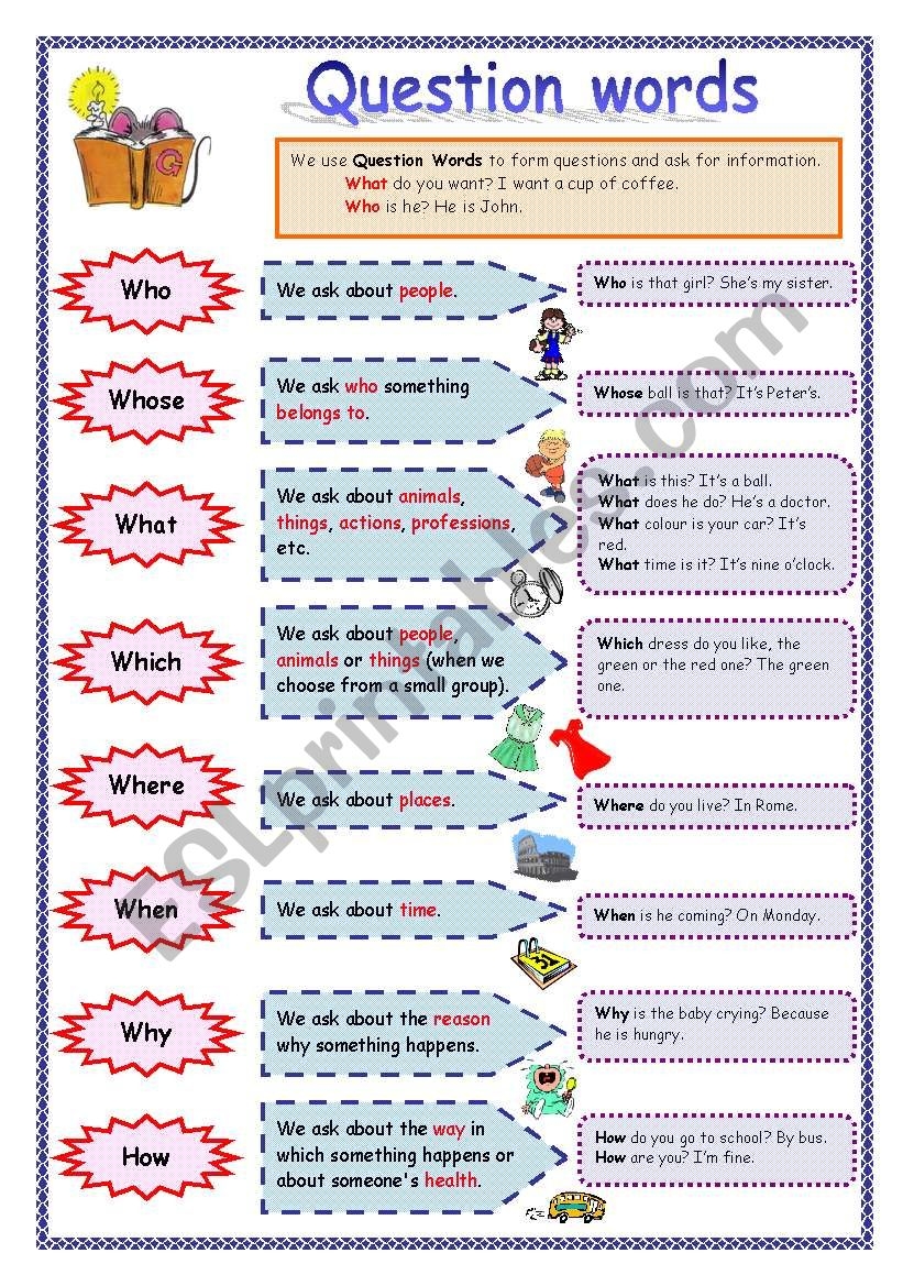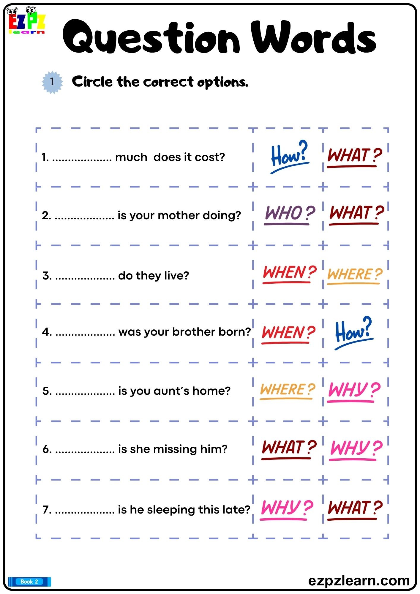 In classrooms, teachers use Question Words Worksheet to assess student understanding. For instance, a math worksheet might include simple addition problems, while an English worksheet may have vocabulary exercises.