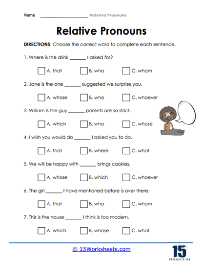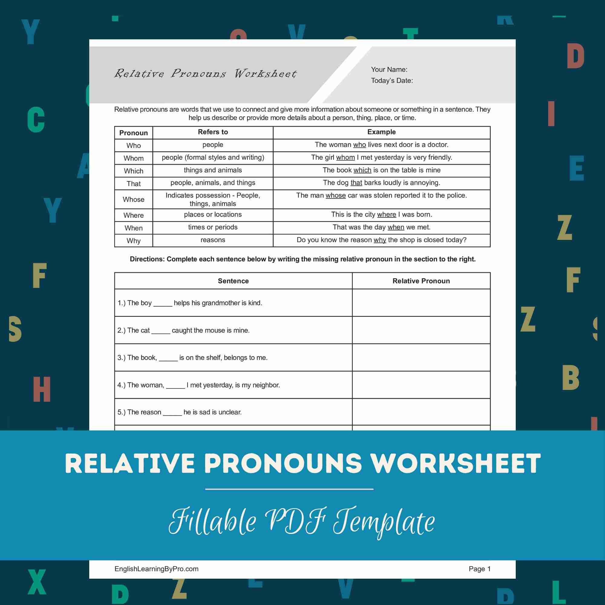 In classrooms, educators use Relative Pronouns Worksheet to assess student understanding. For instance, a math worksheet might include fractions to solve, while an English worksheet may have reading tasks.