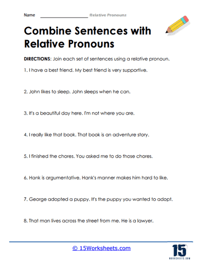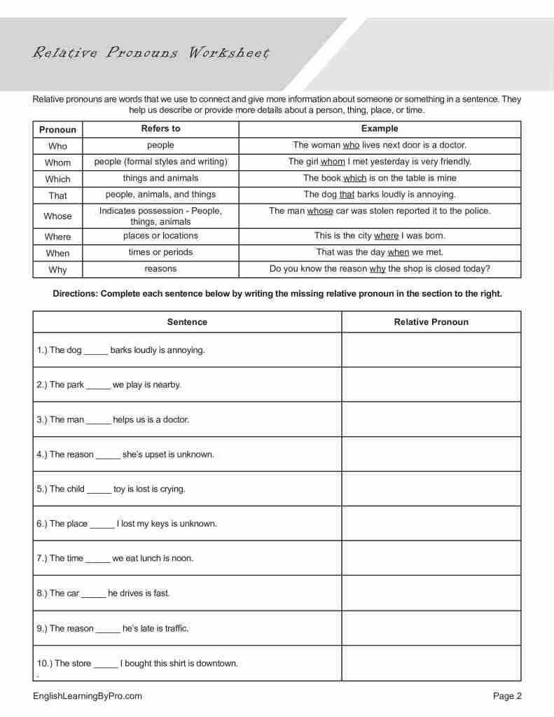 On the worksheet, you will find exercises that focus on identifying and using relative pronouns in sentences. You will have the opportunity to fill in the blanks with the correct relative pronoun, rewrite sentences using relative pronouns, and complete short passages by adding relative pronouns where needed. By completing these exercises, you will gain confidence in your ability to use relative pronouns accurately.
