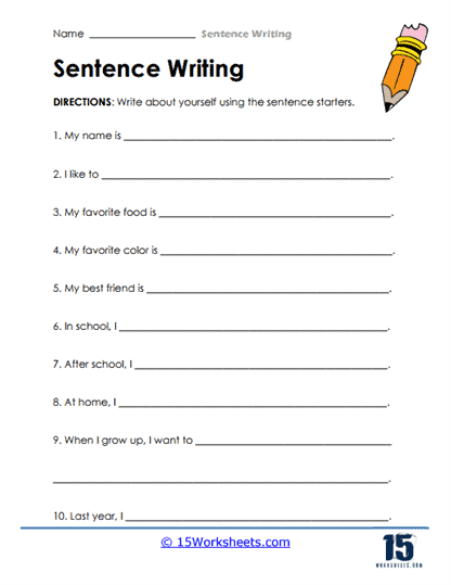 In educational settings, teachers use Sentence Writing Worksheets to reinforce lessons. As an example, a math worksheet might include fractions to solve, while an English worksheet may have vocabulary exercises.