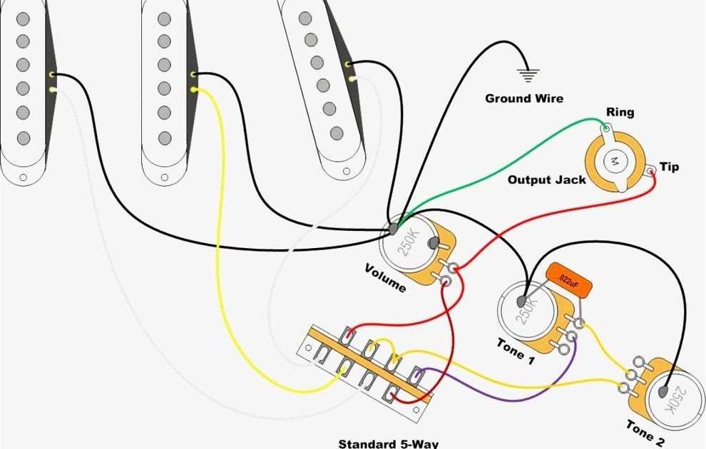 The standard Stratocaster wiring diagram consists of three single-coil pickups, a 5-way switch, and various tone controls. Each pickup is wired to a specific position on the switch, allowing players to select different pickup combinations for a variety of tones. The tone controls can also be modified to alter the guitar’s sound further.