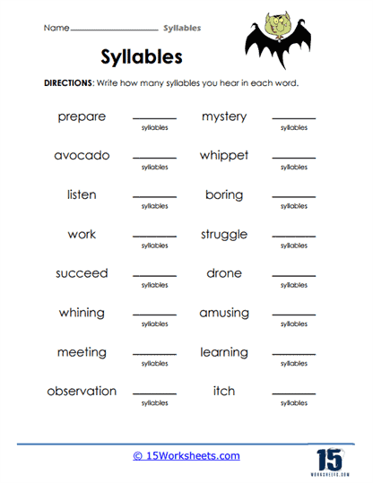 In schools, educators use Syllables Worksheet to help students practice skills. For example, a math worksheet might include simple addition problems, while an English worksheet may have reading tasks.