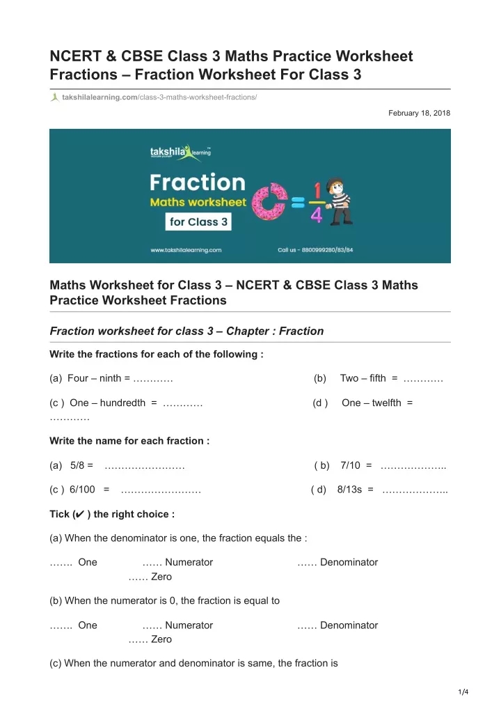 PPT NCERT CBSE Class 3 Maths Practice Worksheet Fractions Fraction
