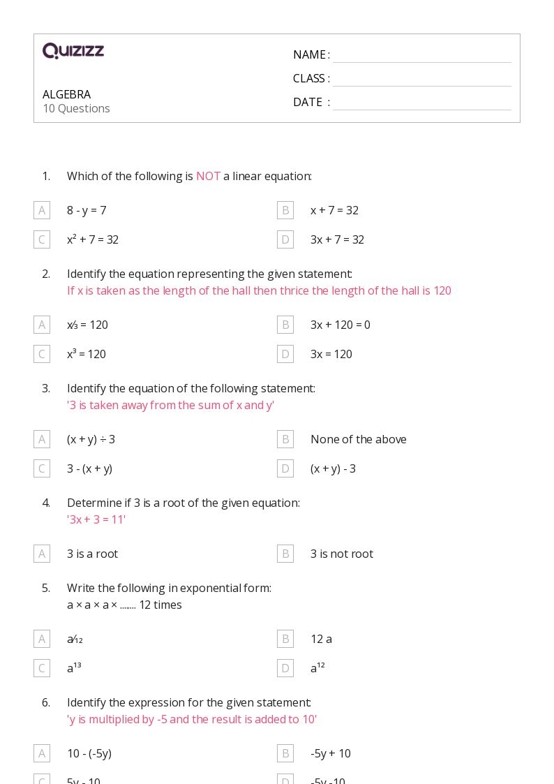 50 Algebra Worksheets For 6th Class On Quizizz Free Printable