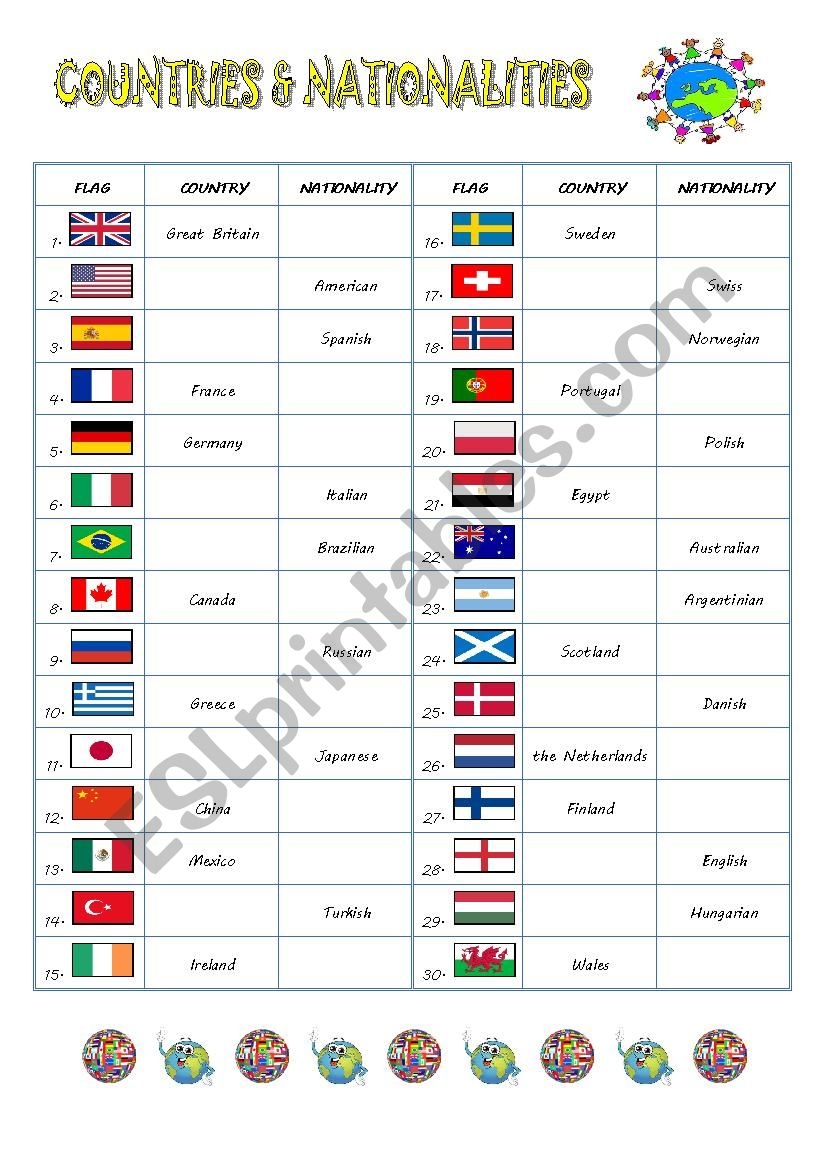 Are you looking for a fun and educational way to teach your students about countries and nationalities? Look no further! This worksheet is a great resource for helping students learn about different countries and the people who live there.