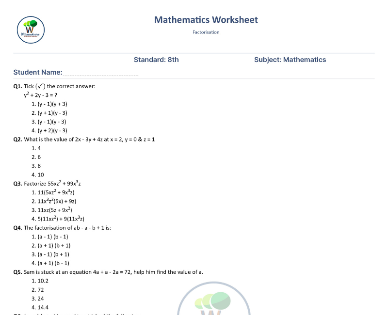 Our Factorisation Class 8 worksheet includes a variety of problems for you to solve. From simple equations to more complex expressions, this worksheet will challenge you to think critically and apply your factorisation skills. By working through these problems, you’ll gain a better understanding of factorisation and build confidence in your math abilities.
