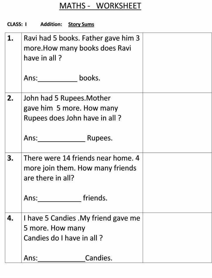 Story Sum Class 1 Maths Worksheet
