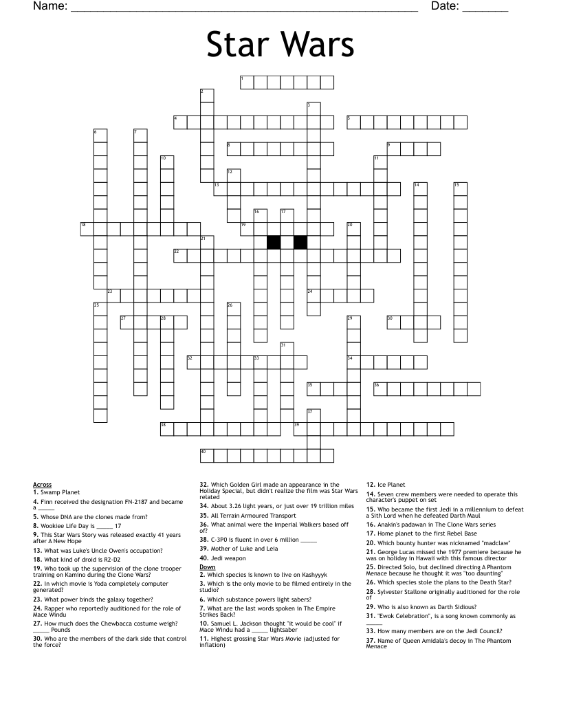 So grab your lightsaber, hop in your X-wing, and get ready to embark on a puzzle-solving adventure in a galaxy far, far away. May the Force guide you as you tackle this Star Wars Crossword Printable and discover all the hidden words and phrases waiting to be found.