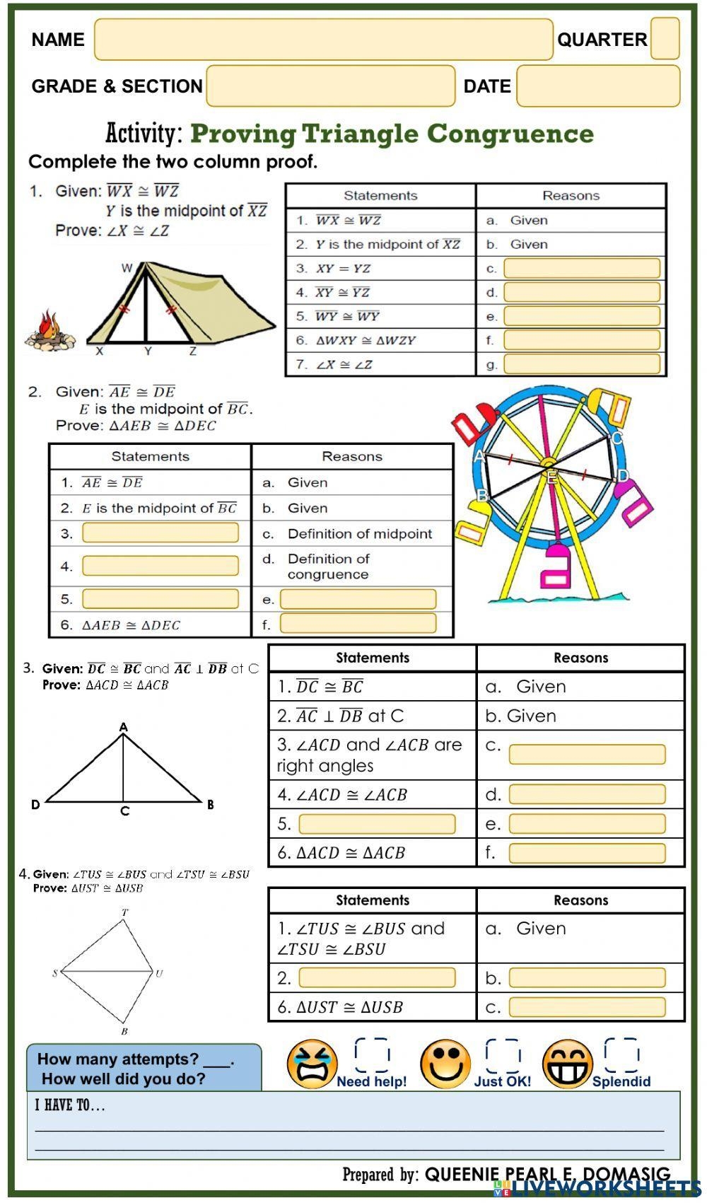 By working through a triangle congruence worksheet, students can reinforce their knowledge of triangle congruence postulates, such as Side-Side-Side (SSS), Side-Angle-Side (SAS), and Angle-Side-Angle (ASA). These worksheets often include a mix of multiple-choice, matching, and problem-solving questions to test students’ understanding of congruence concepts.
