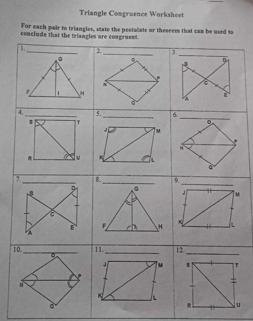 One common type of question on a triangle congruence worksheet asks students to identify which congruence postulate can be used to prove that two triangles are congruent. Students must carefully analyze the given information about the triangles and determine the appropriate postulate to apply.